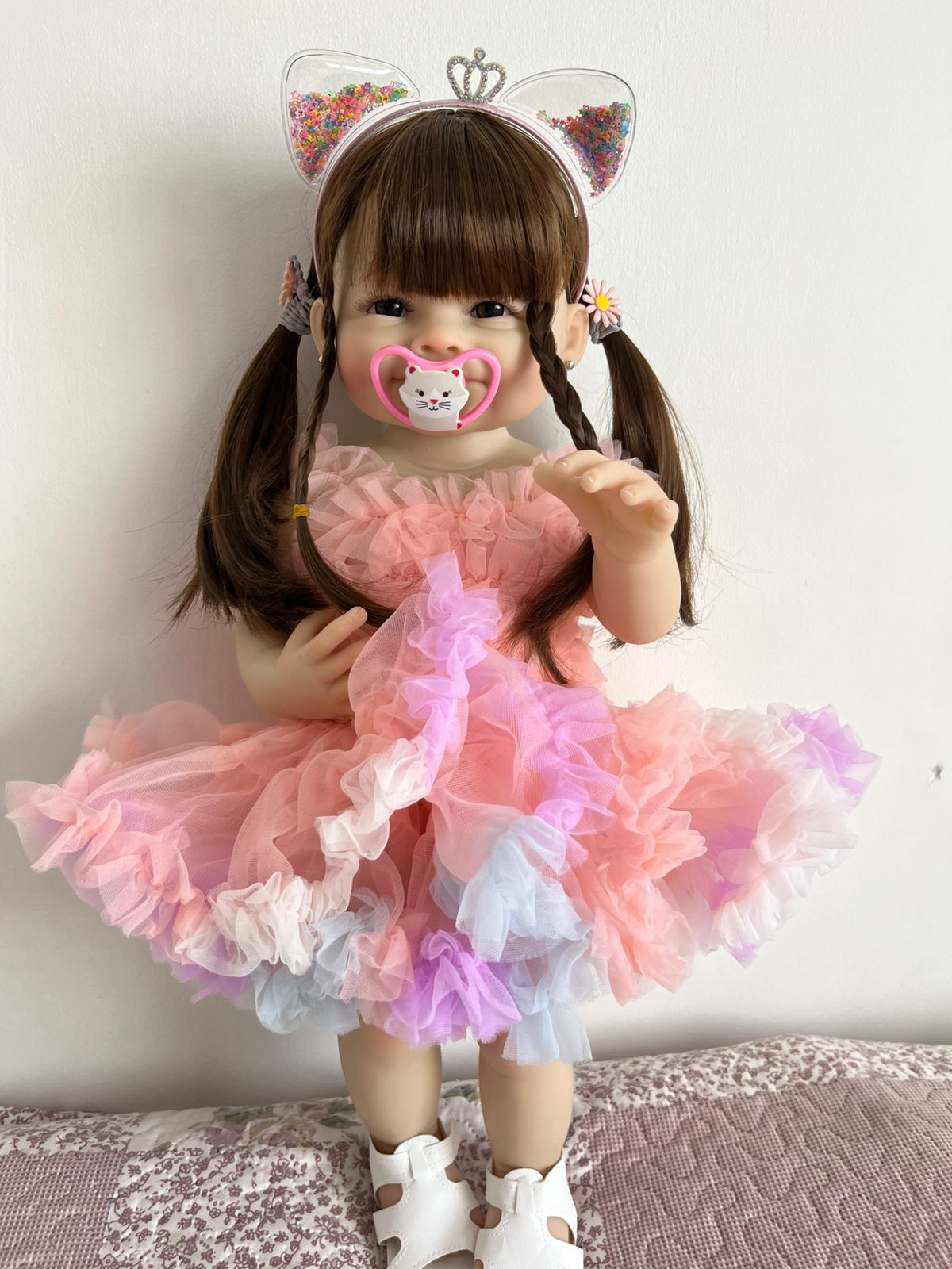 Con un tamaño ideal de aproximadamente 50 cm, tiene una presencia muy realista que enamora desde el primer momento. Su diseño delicado, sus ojitos expresivos y su ropita en tonos suaves hacen que cada detalle invite a abrazarla, vestirla y cuidarla.